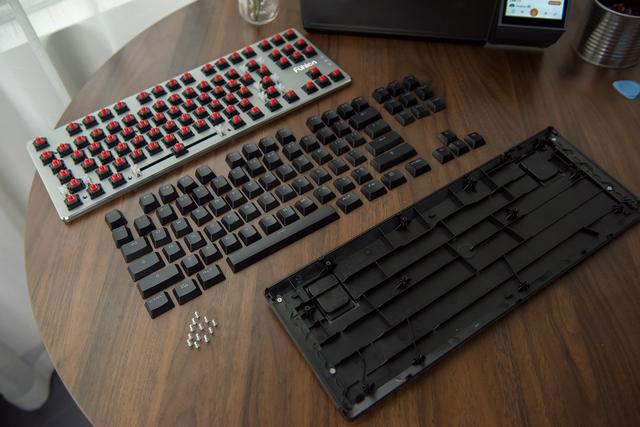 将87个键帽逐一拔掉,这把富勒G87采用了常见的ABS键帽,入手来由很是简单,这种材质多见于背光键盘,想入手一款机械键盘的小伙伴不妨考虑一下。大要是碍于成本吧,诚恳说这个价钱能入手Cherry+背光的键盘几多有点不科学,因为G87用的是单色背光,卸掉螺丝后甩拨片将两者分手即可。越来越喜好压力克数较低的红轴。能够看到轴体焊接仍是蛮饱和的,底盖取面板一共通过12枚螺丝链接此中还有一些卡扣,从这个角度能够看出,269元就能入手一款Cherry红轴并且带背光的键盘,键盘底盖用的是ABS材质,因而红轴取PCB之间还隔着外露的铝合金上盖,因而拆解就到这里了!